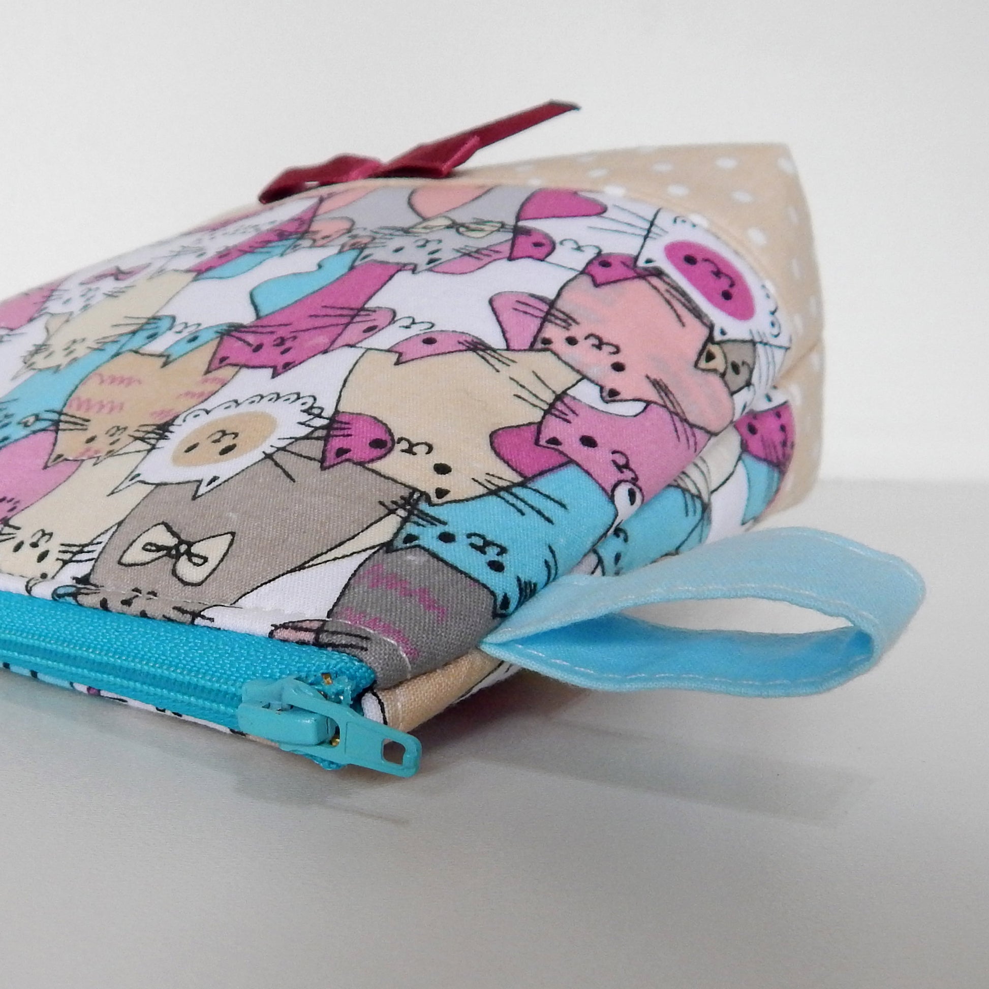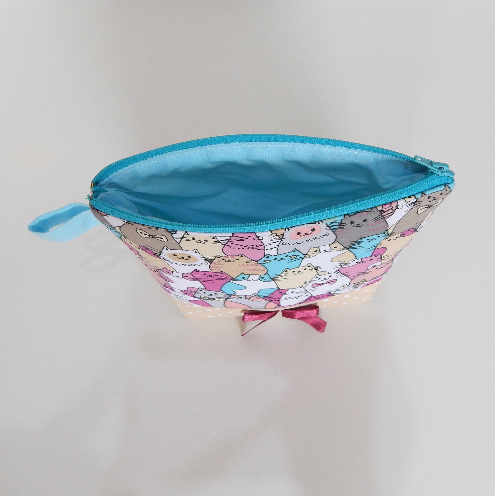 This handmade cat print purse features cotton canvas, a soft cotton lining and satin bow – perfect for storing small essentials or gifting to feline fans.