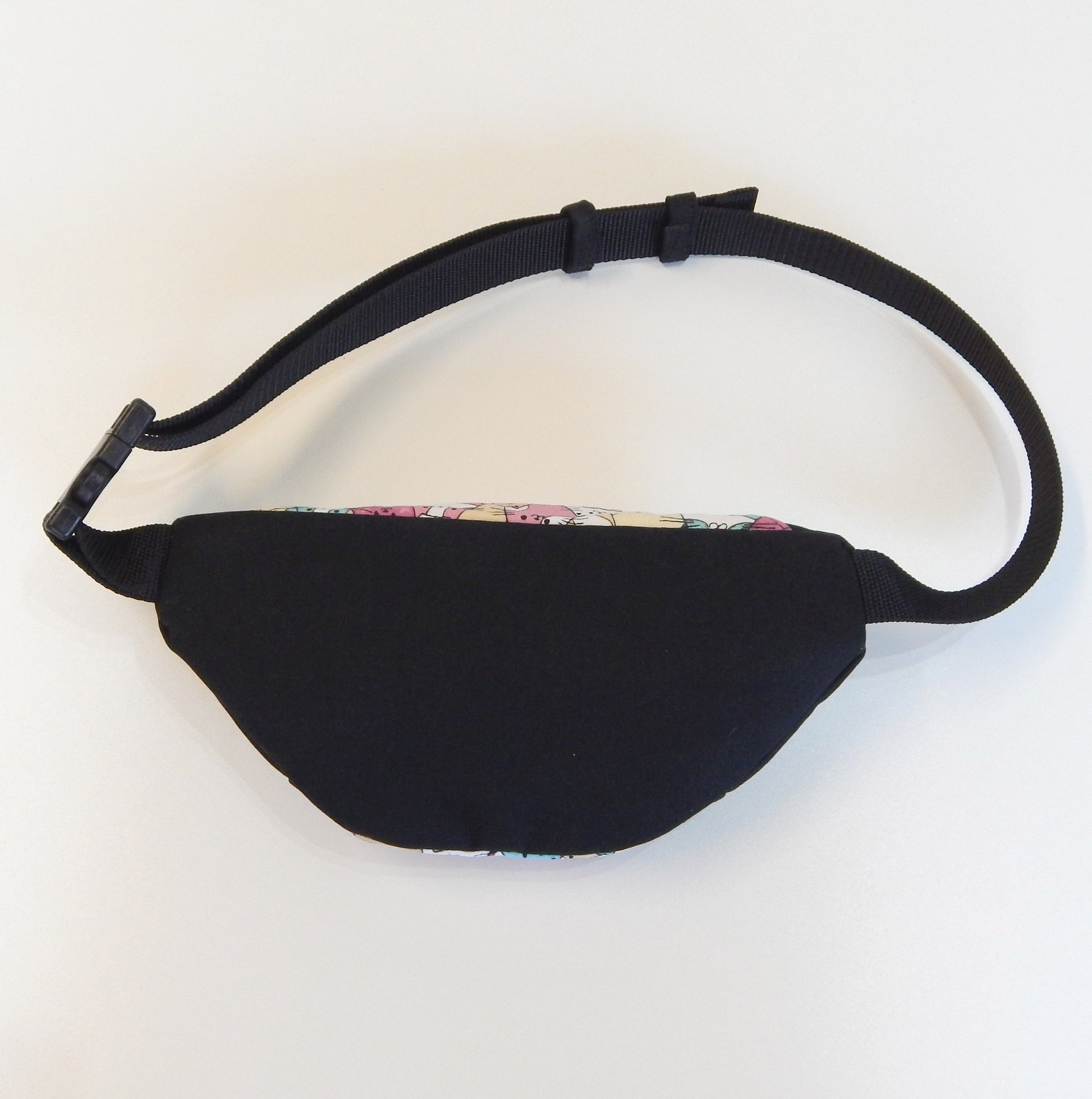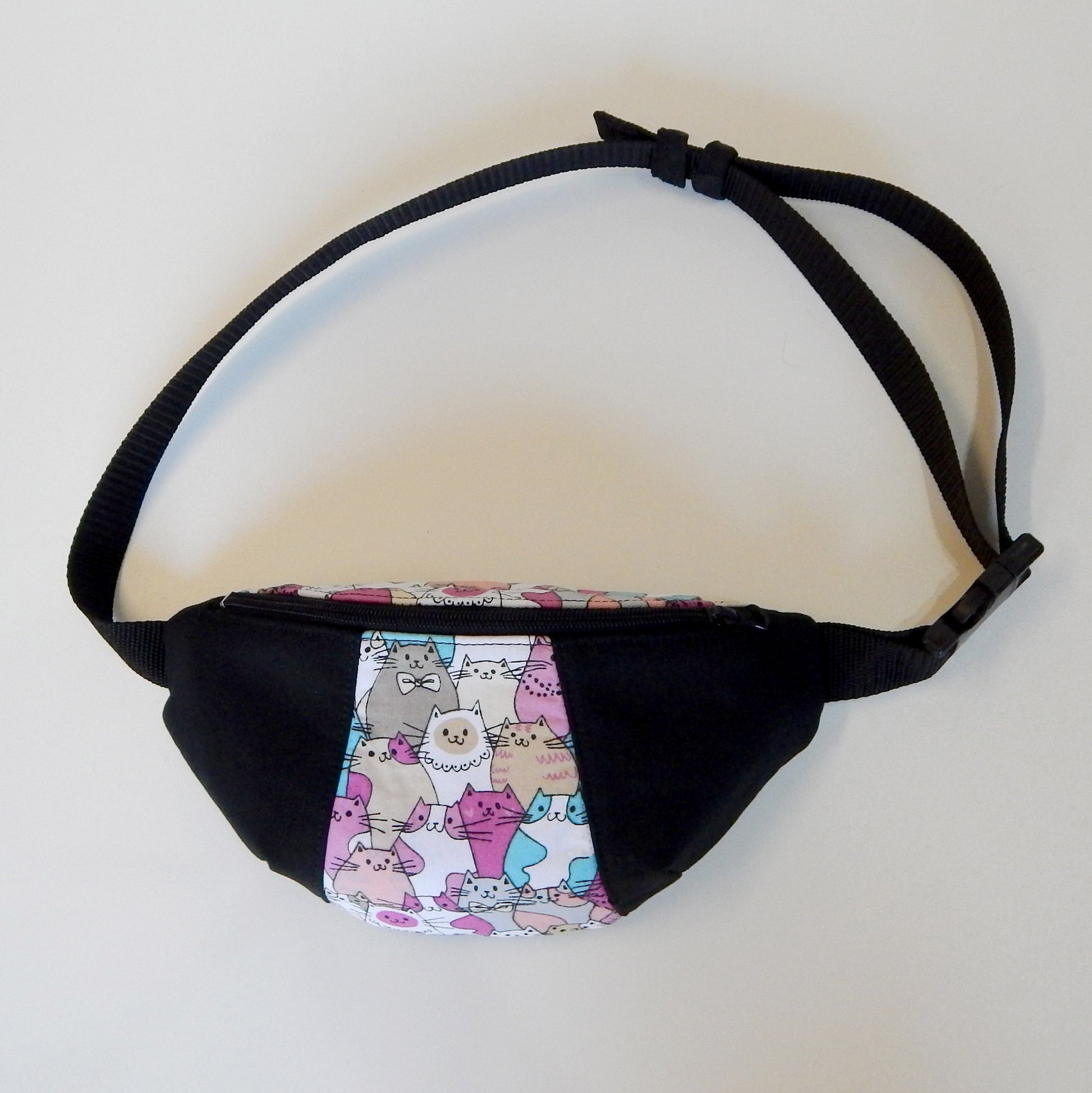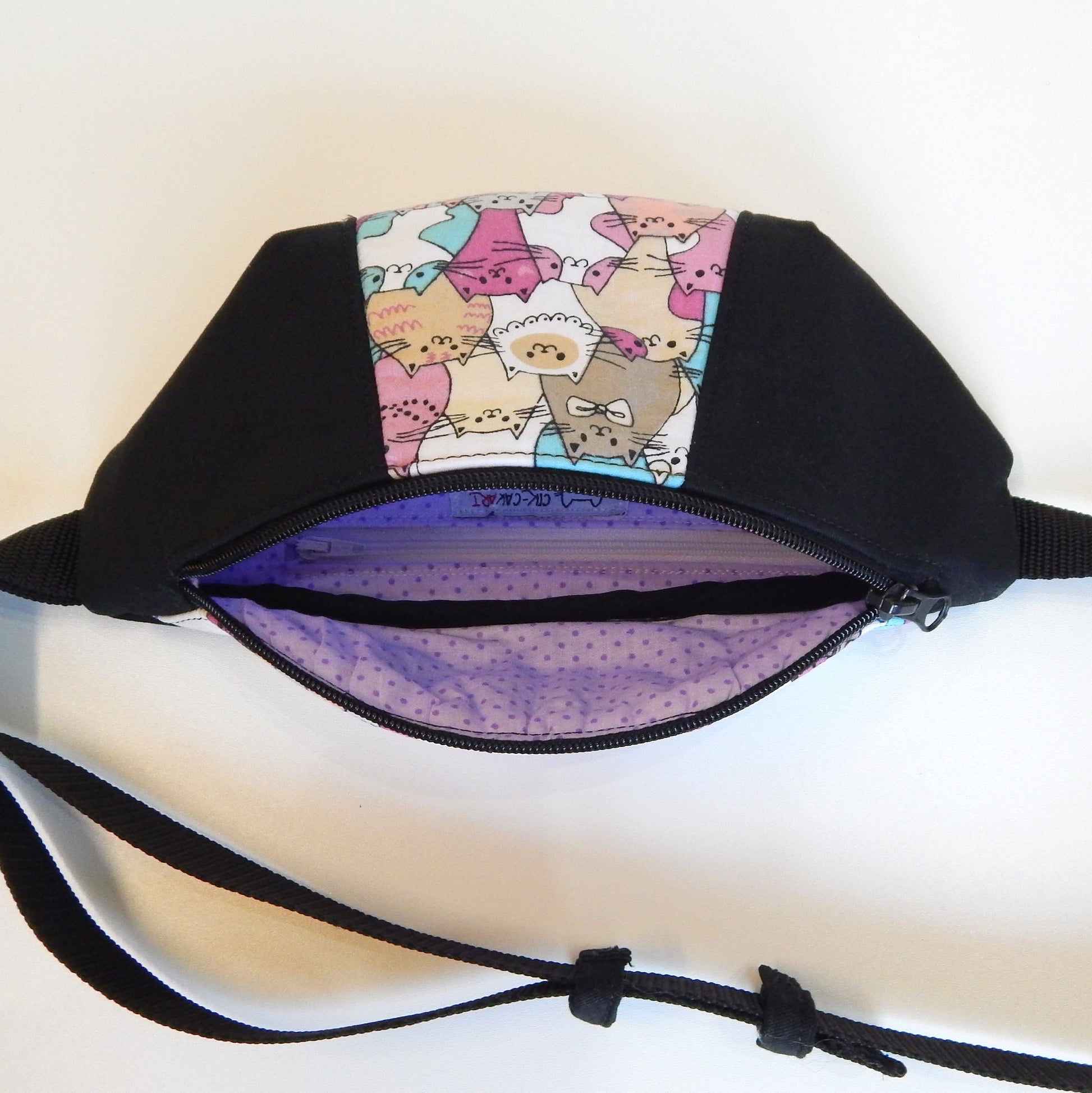 Meow in motion. This handmade hip bag features a playful multicolor cat print on black cotton twill, paired with a vibrant lilac polka dot lining. Compact yet practical, it’s designed to carry your essentials — phone, wallet, keys, or lipstick — while keeping your hands free.