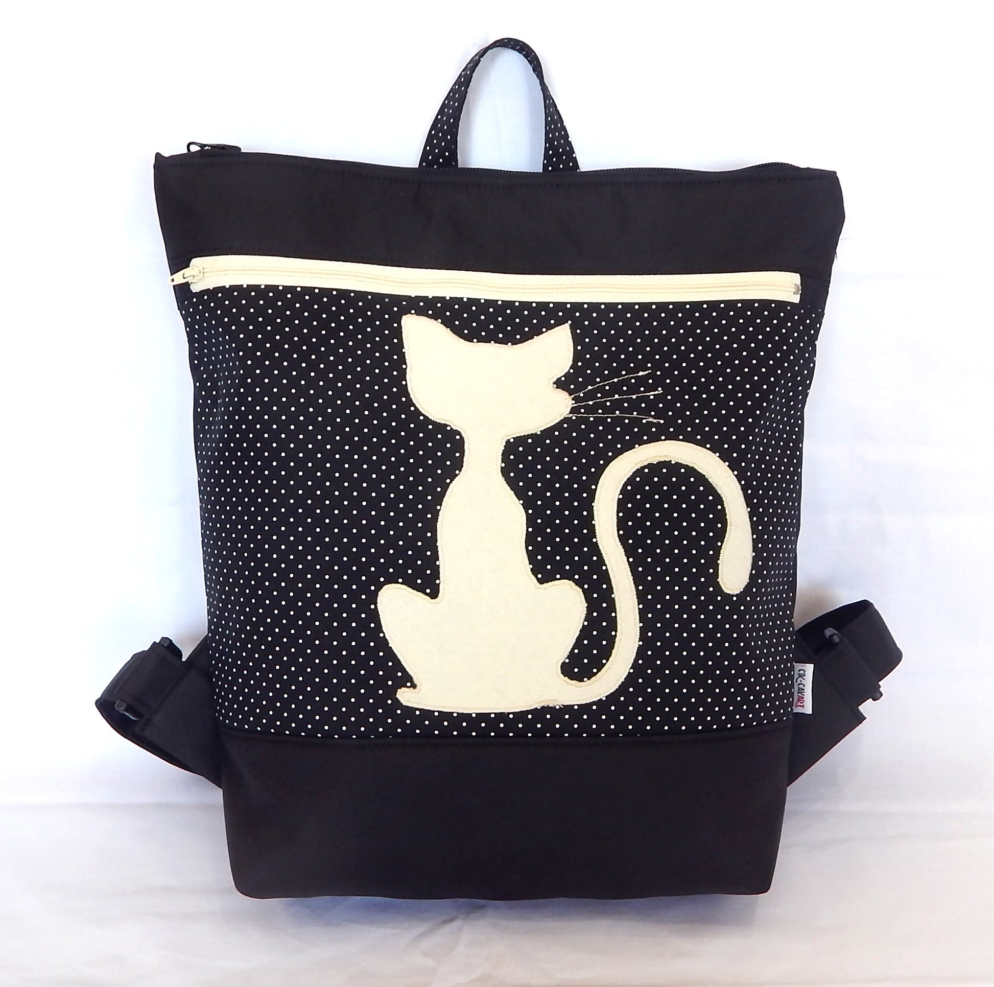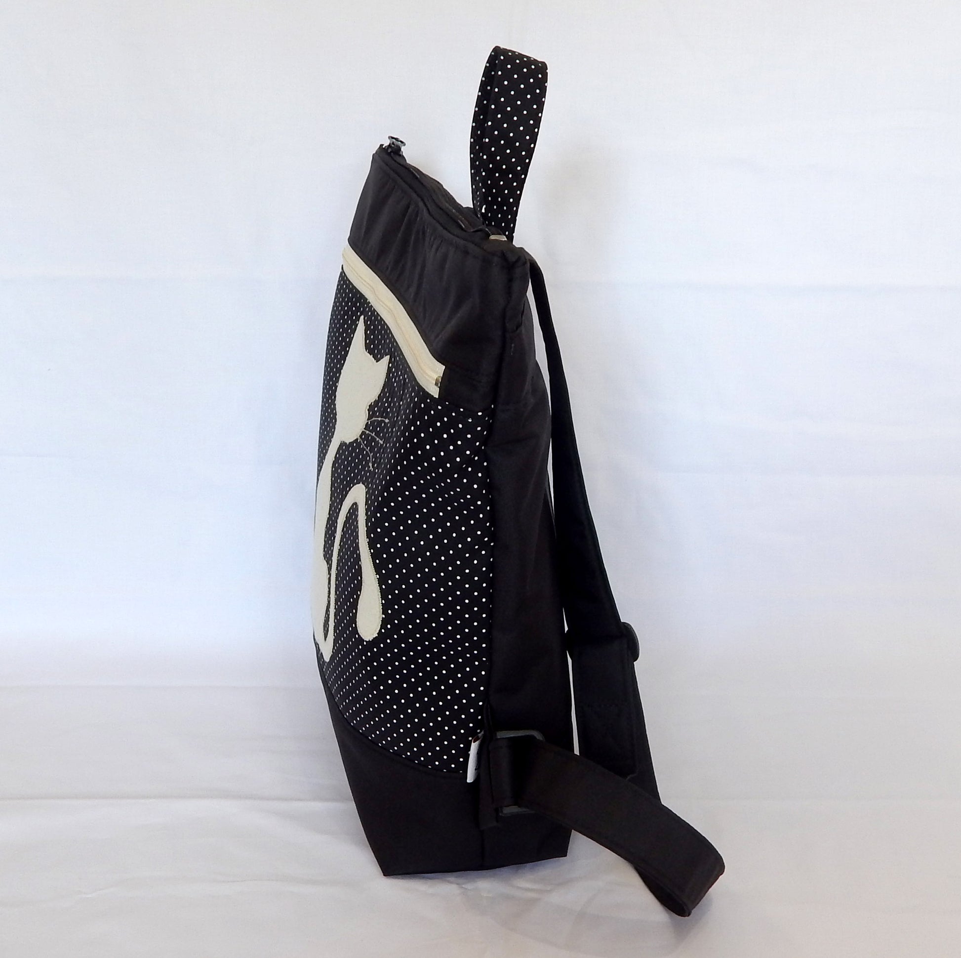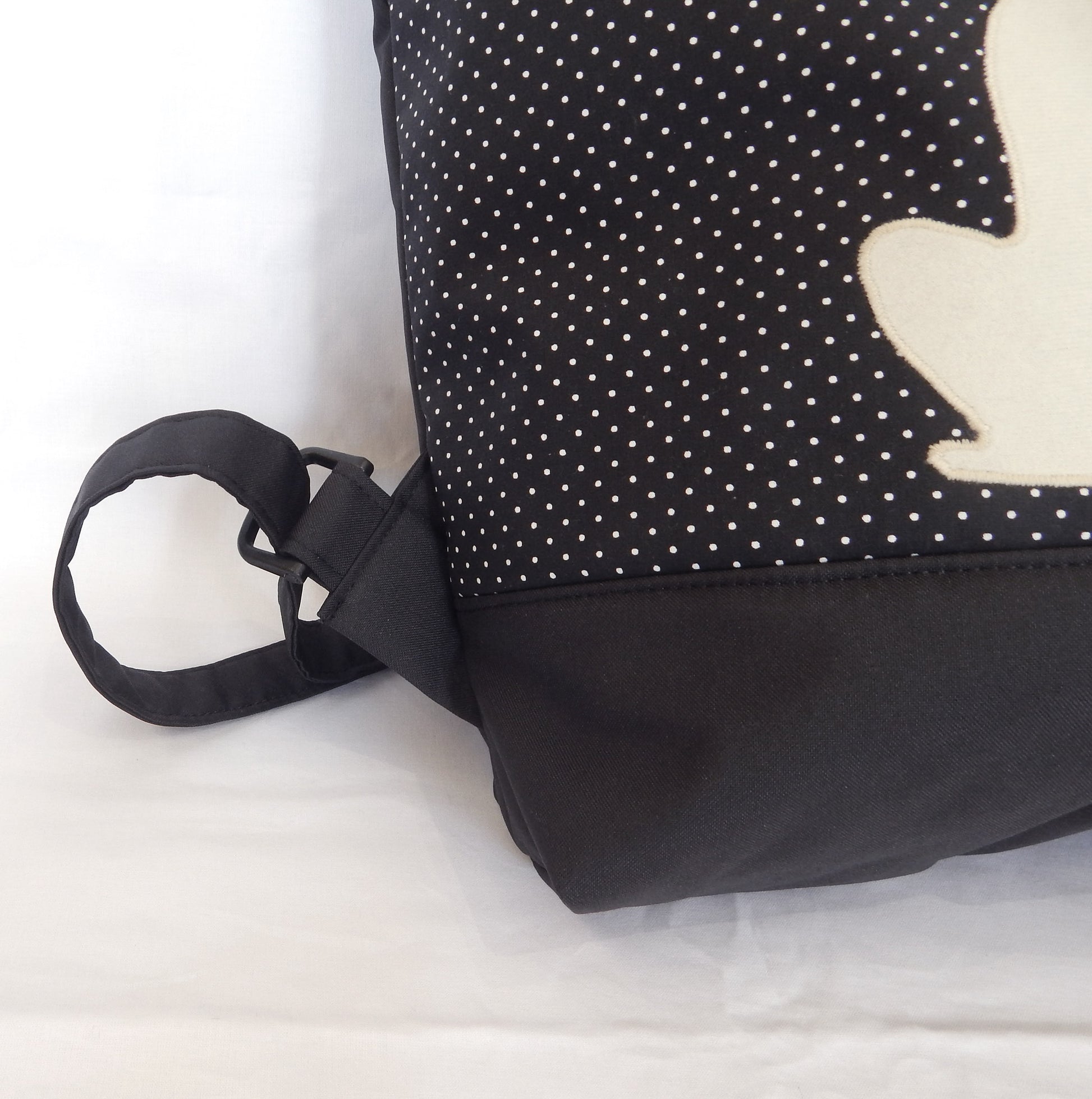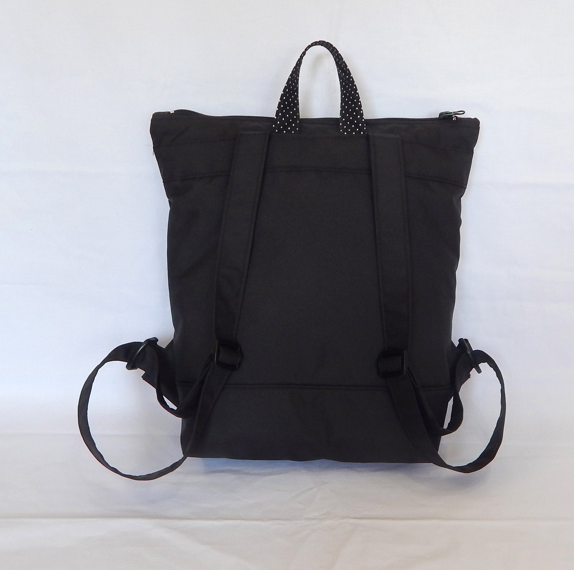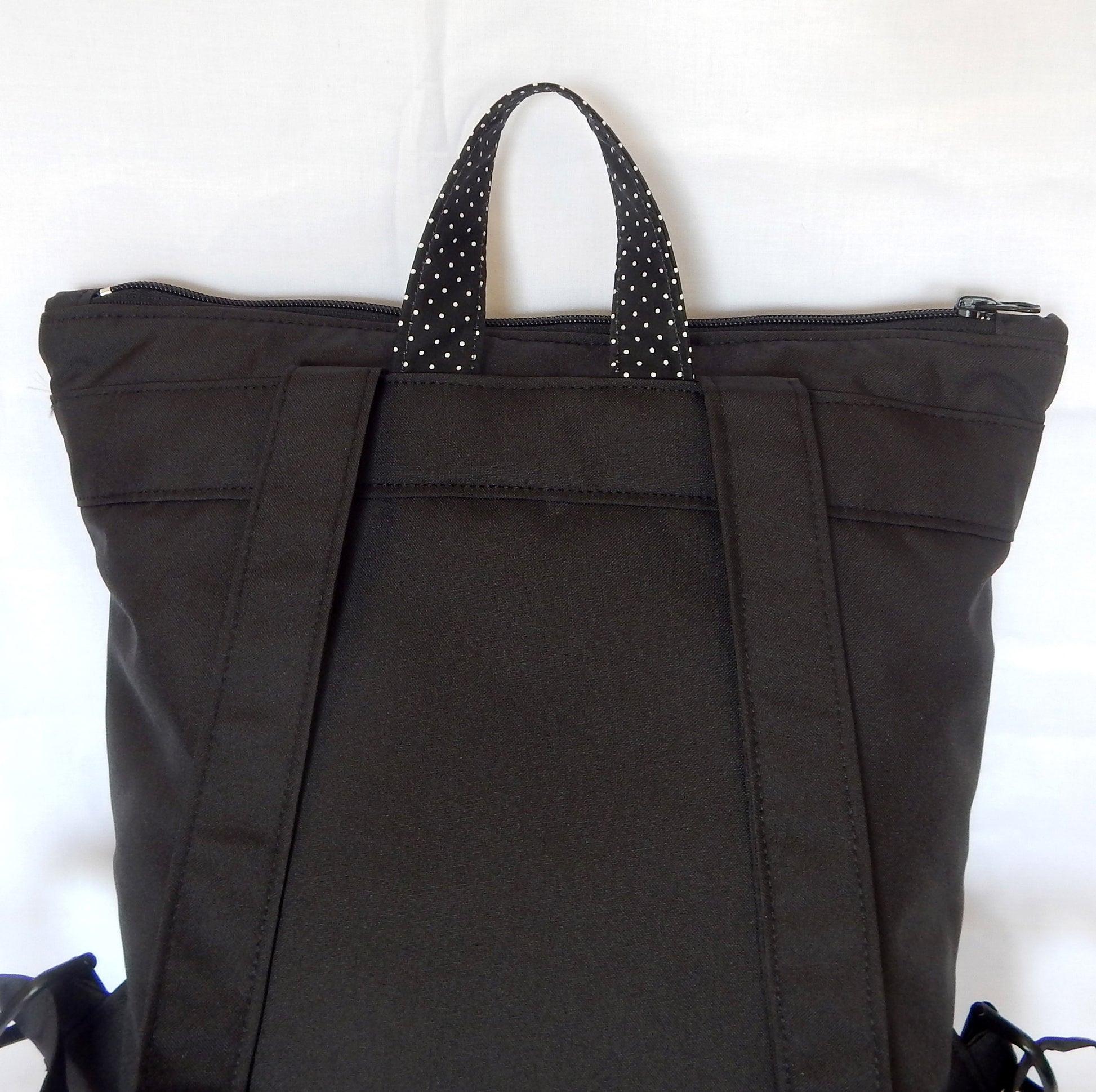 Black polka dot fabric is medium weight water resistant cotton, black fabric is water resistant polyester canvas. The backpack is processed with thicker durable interlining and padding fabric.