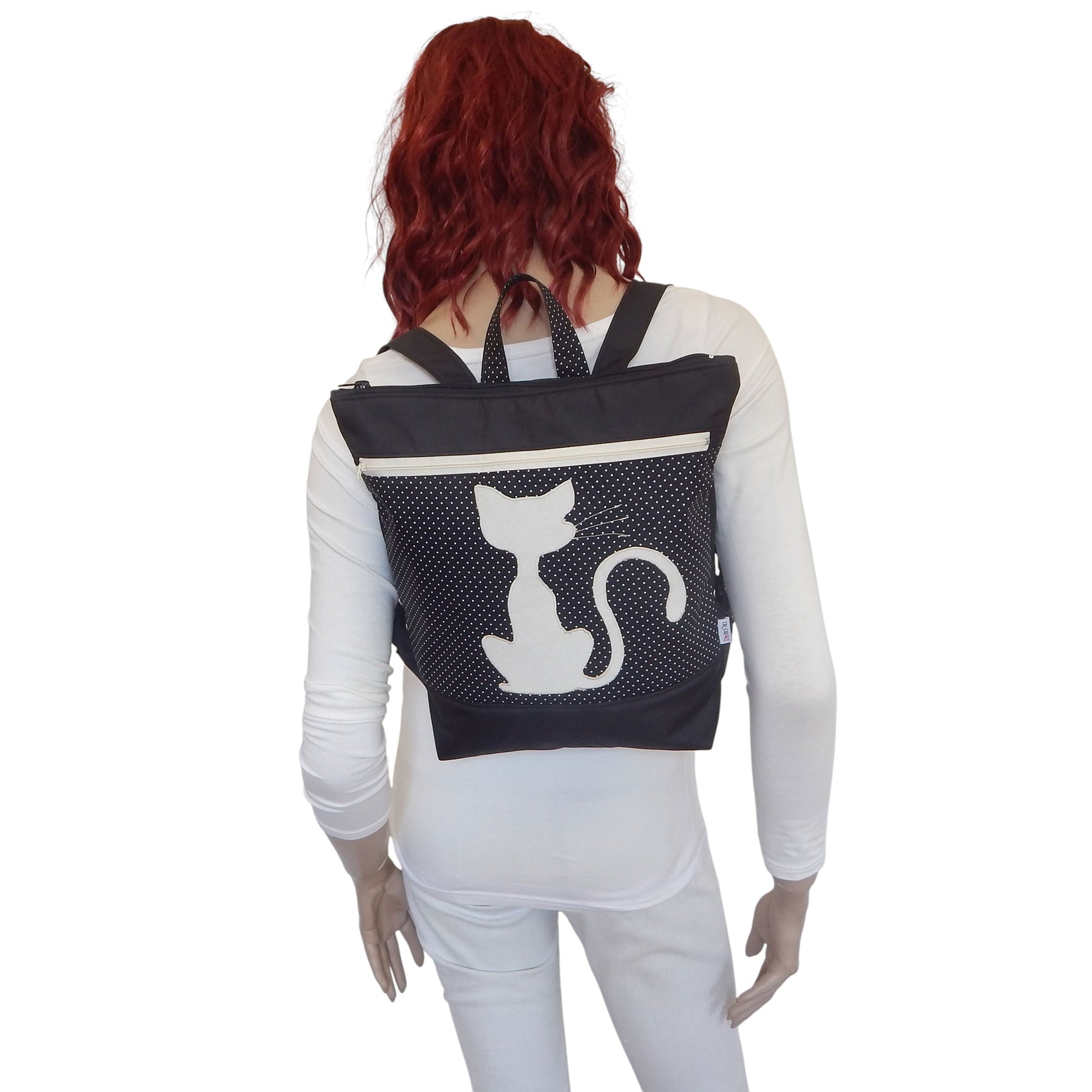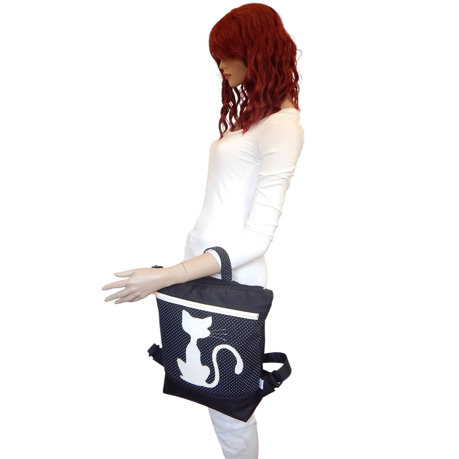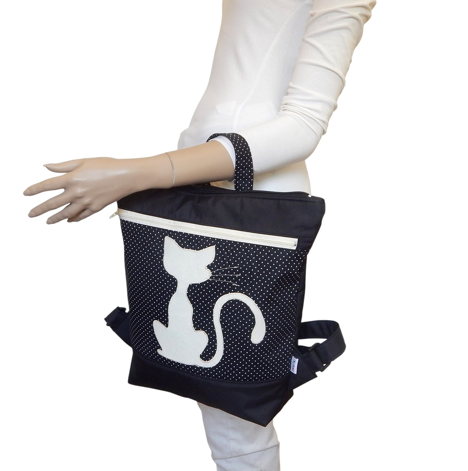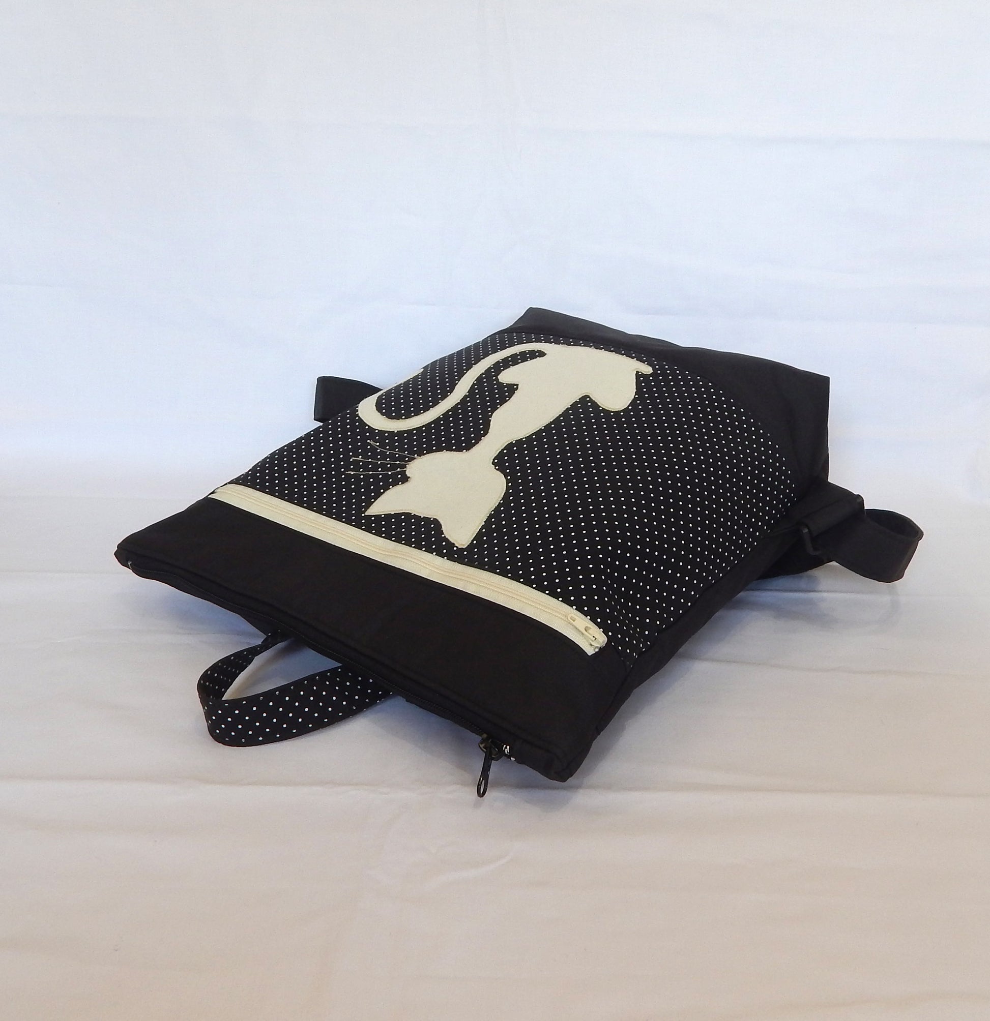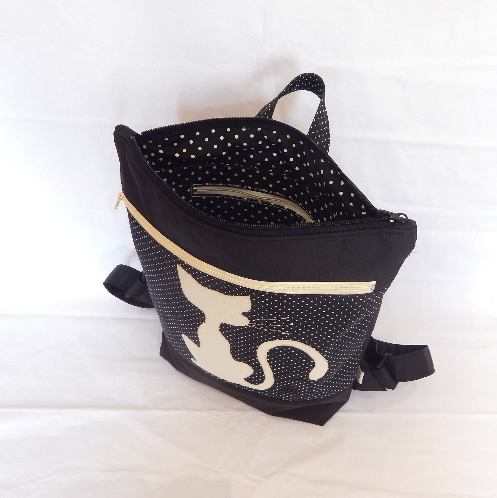 Black polka dot fabric is medium weight water resistant cotton, black fabric is water resistant polyester canvas. The backpack is processed with thicker durable interlining and padding fabric.