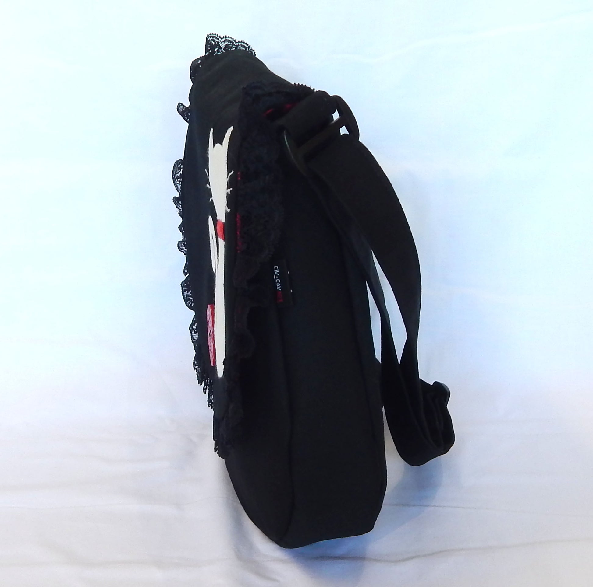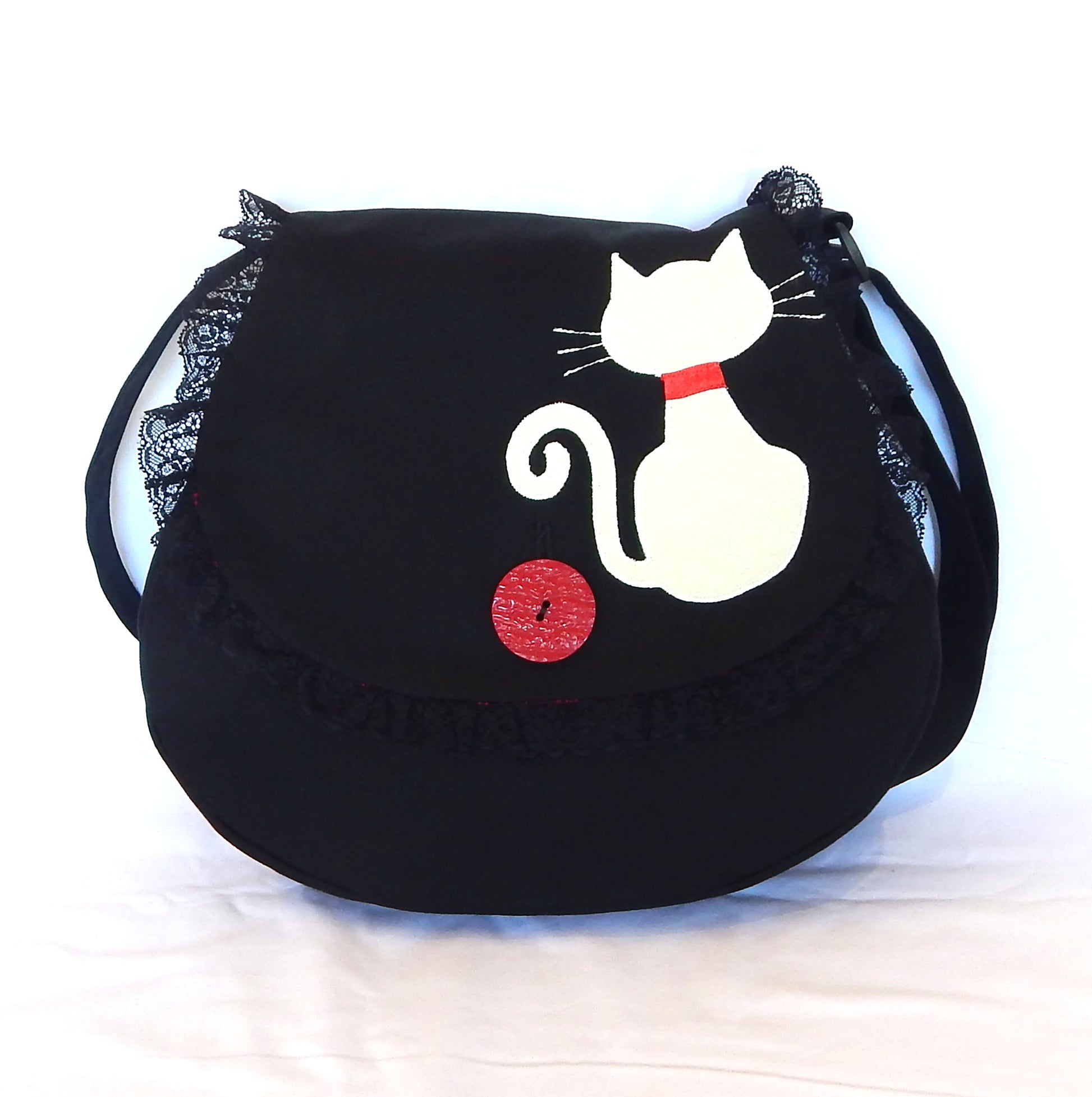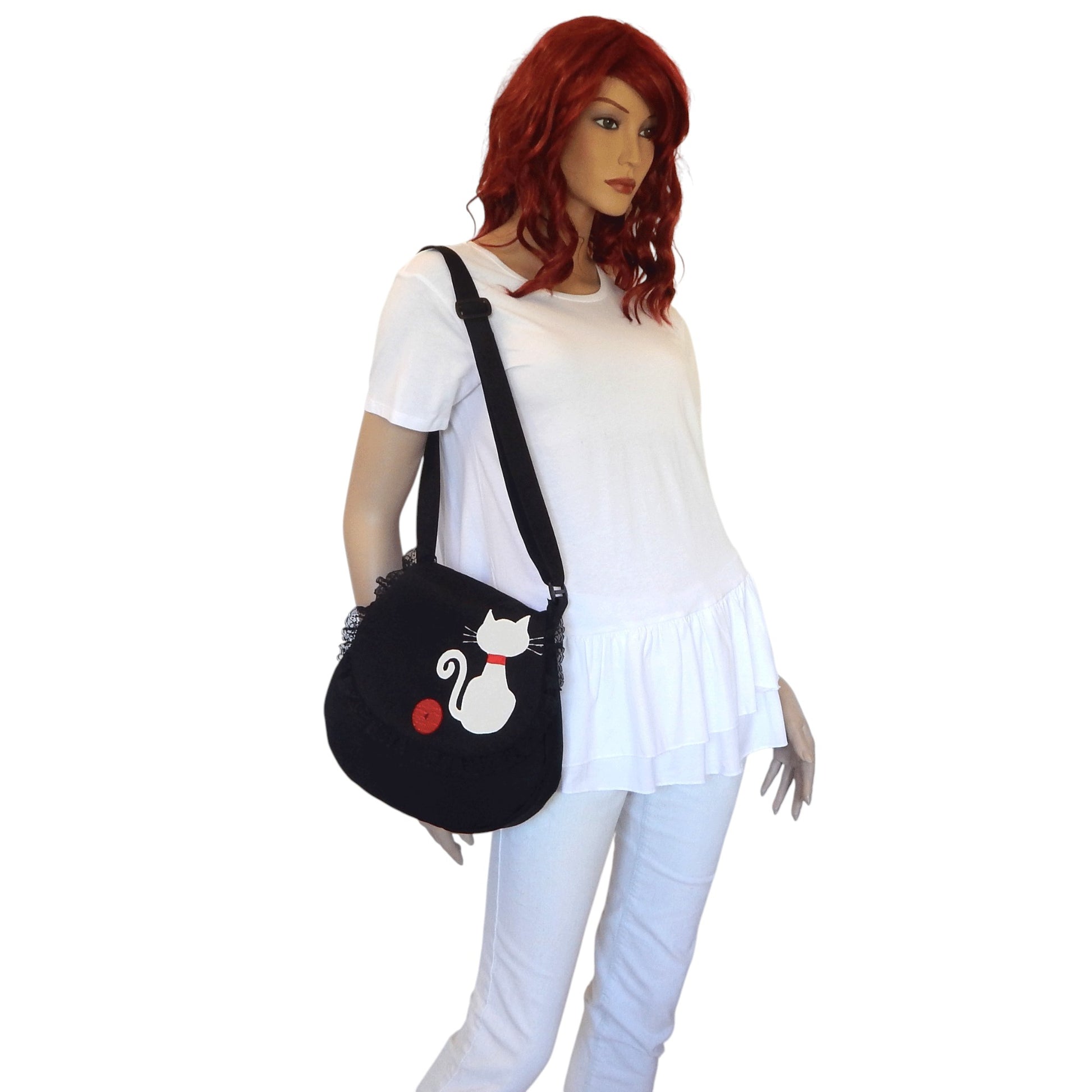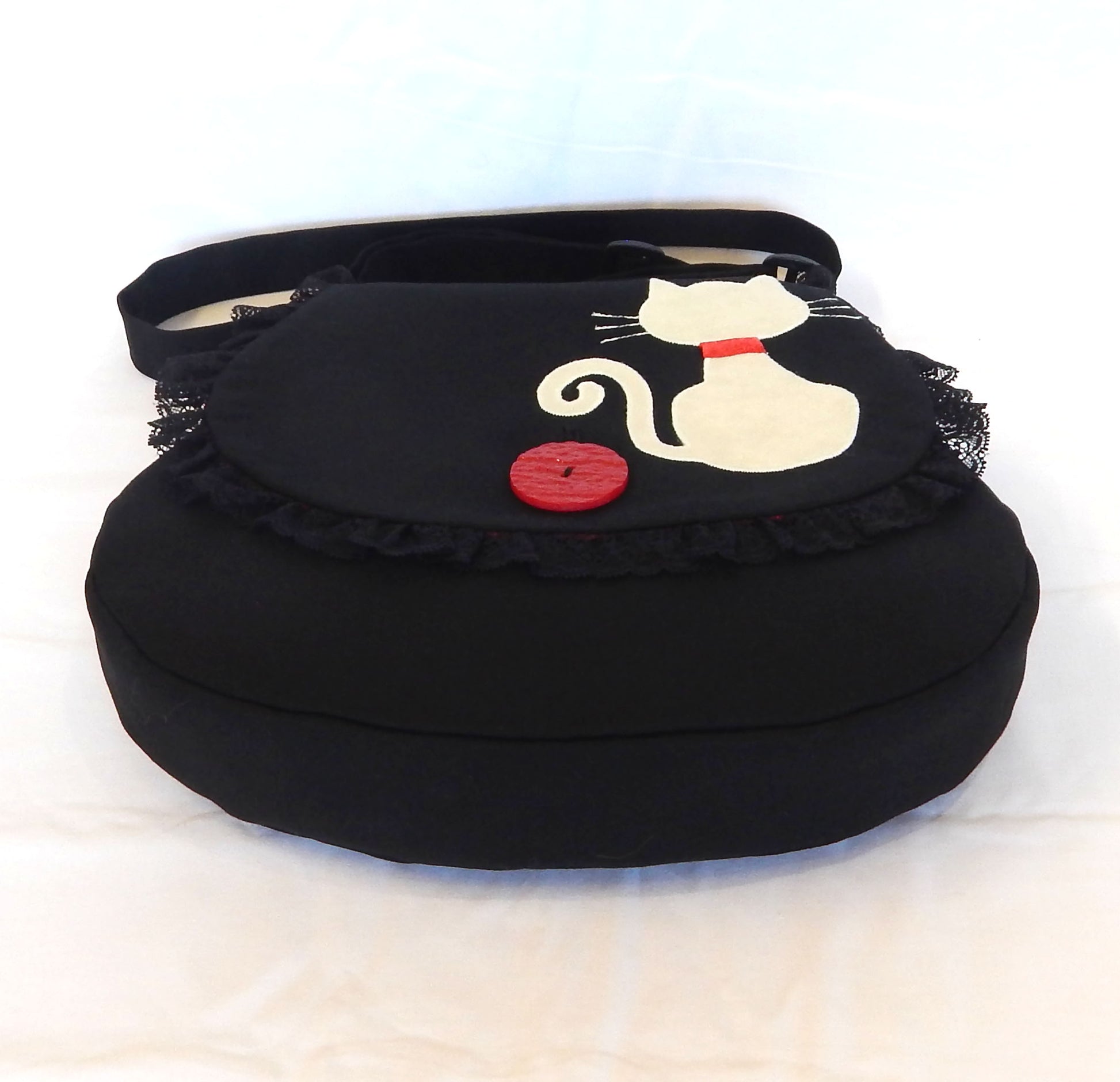 Elevate your style with this handmade cat-themed crossbody bag crafted from a polyester-cotton black twill blend. The cream-colored cat detail, adorned with a charming red ribbon, makes this bag a unique fashion statement. Button is red.