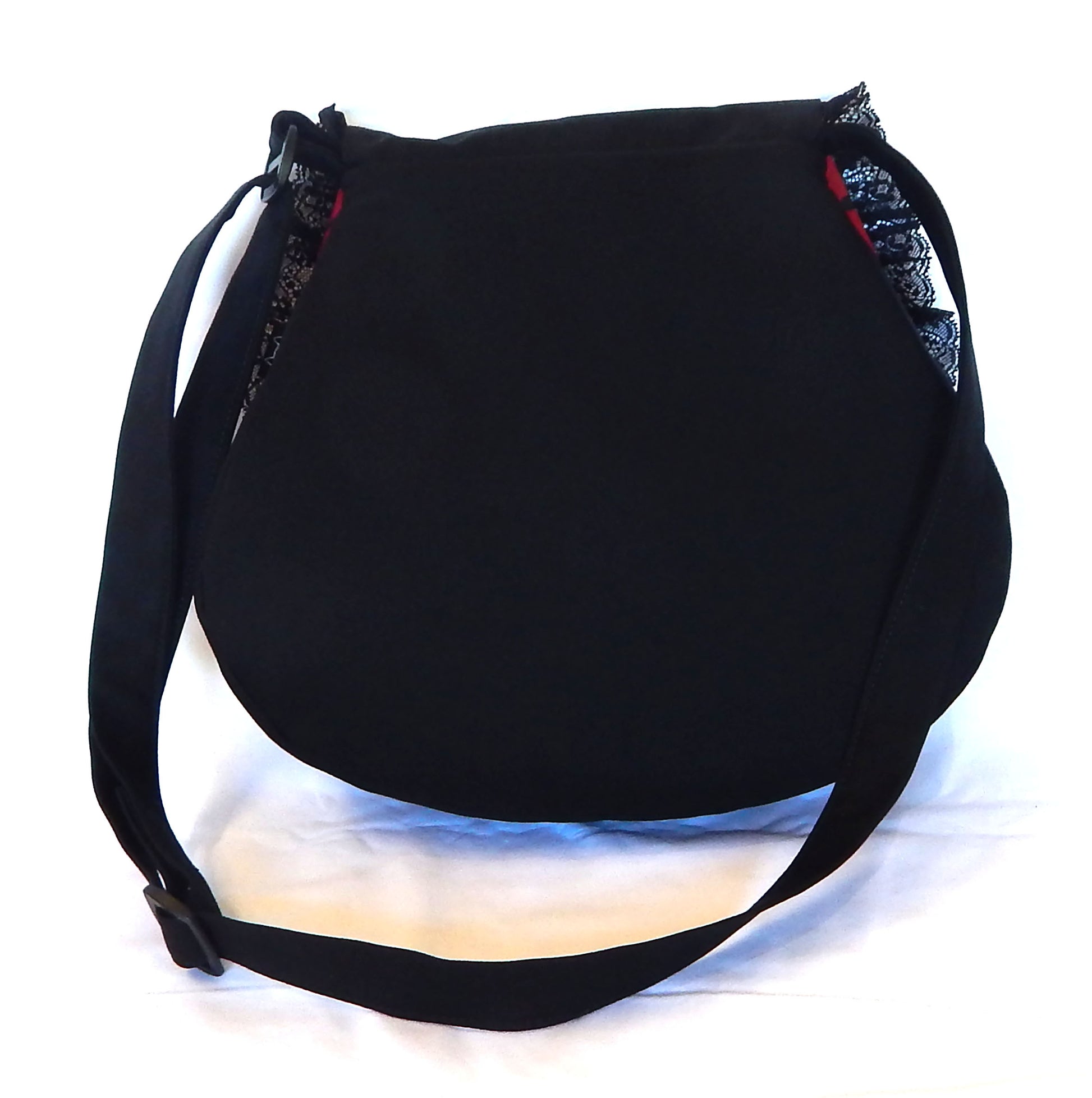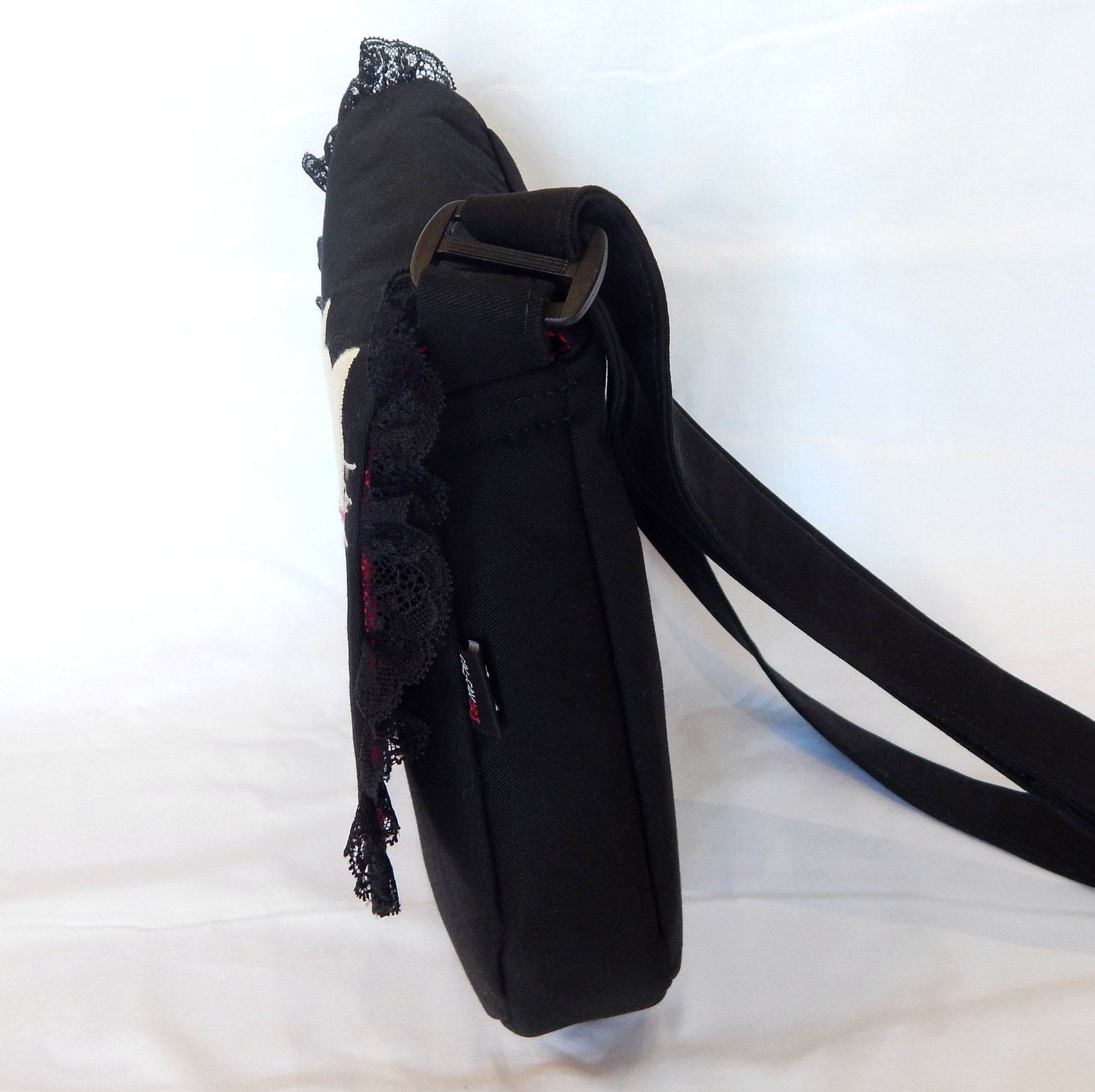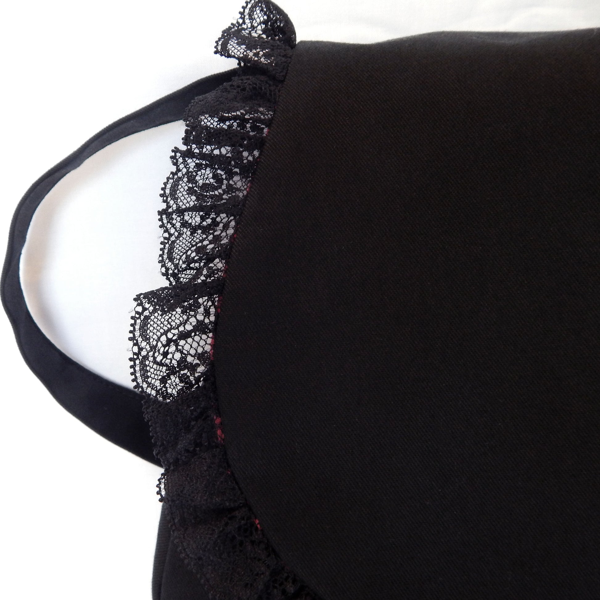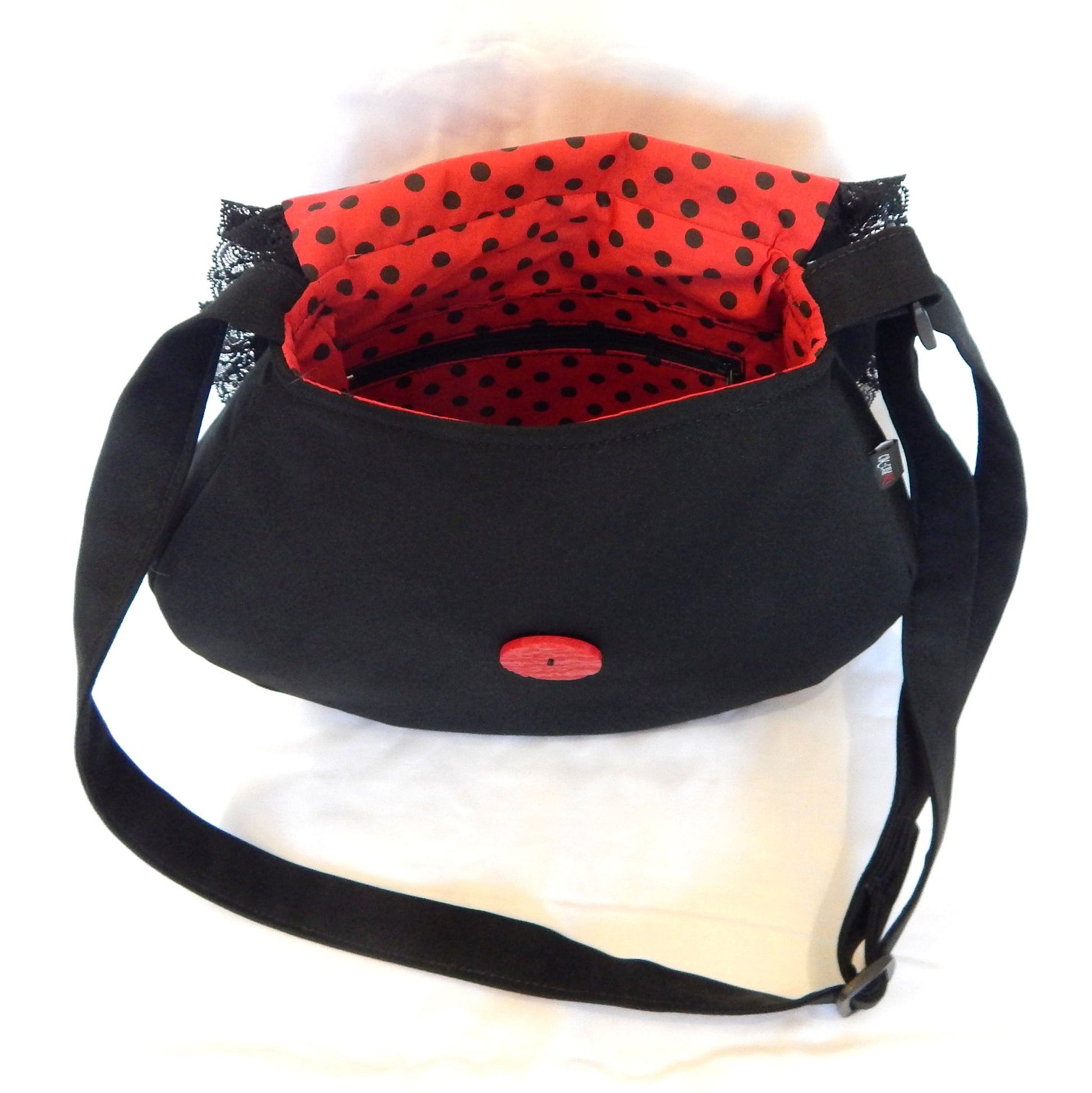 Lined with red-black polka dot cotton fabric and bordered with elegant black lace, this bag combines practicality with whimsical charm. The adjustable shoulder strap ensures a comfortable fit, while the small interior zipper pocket offers secure storage.