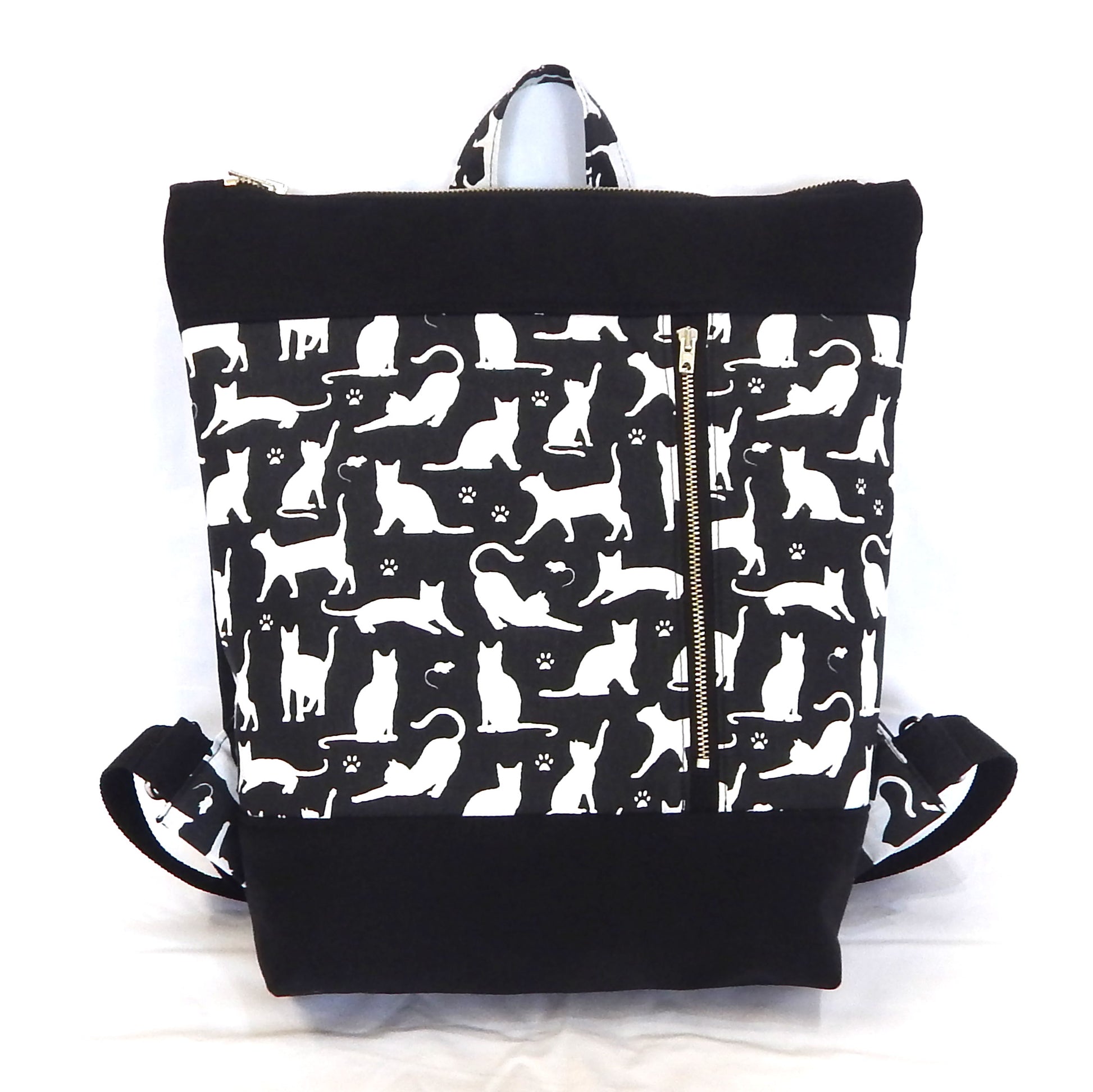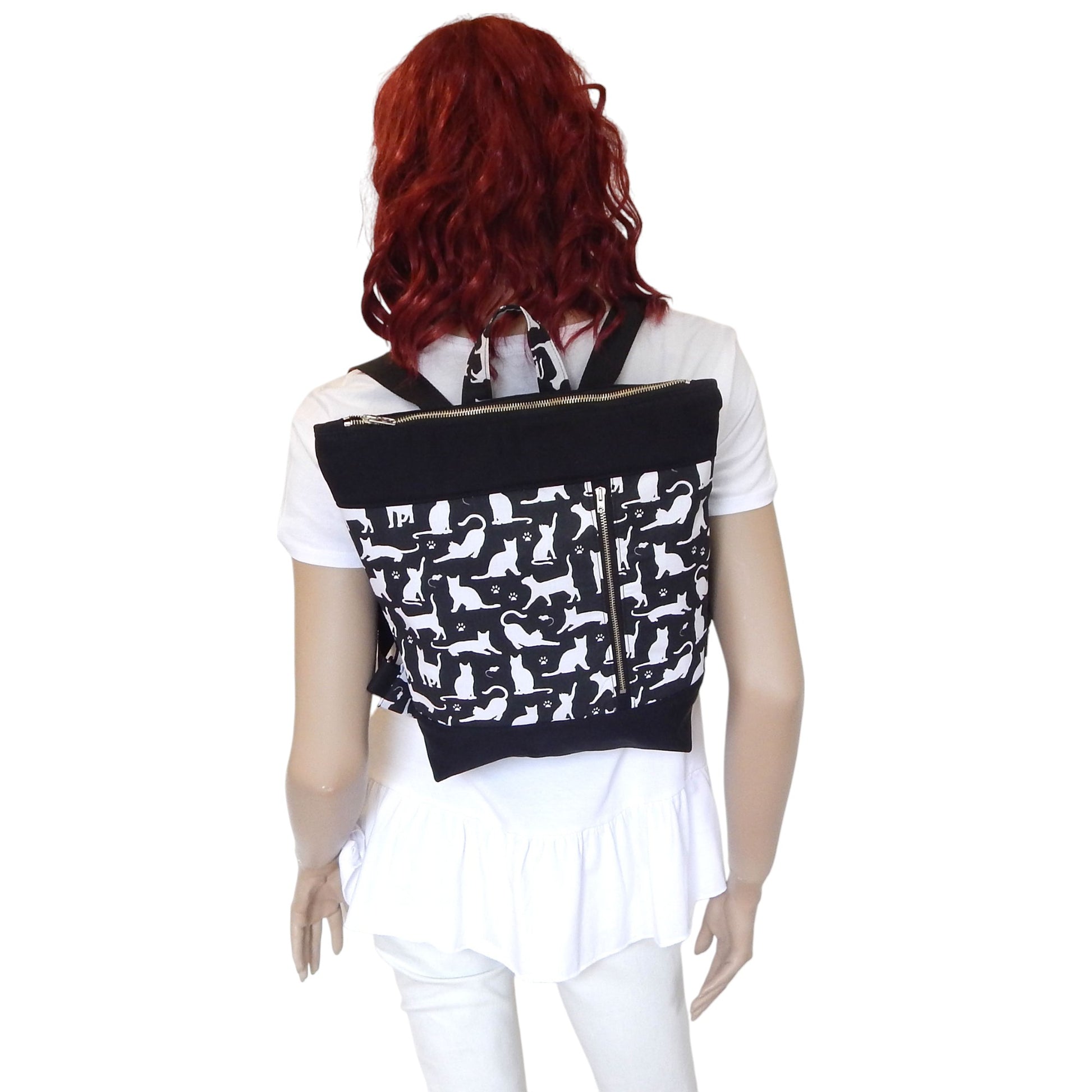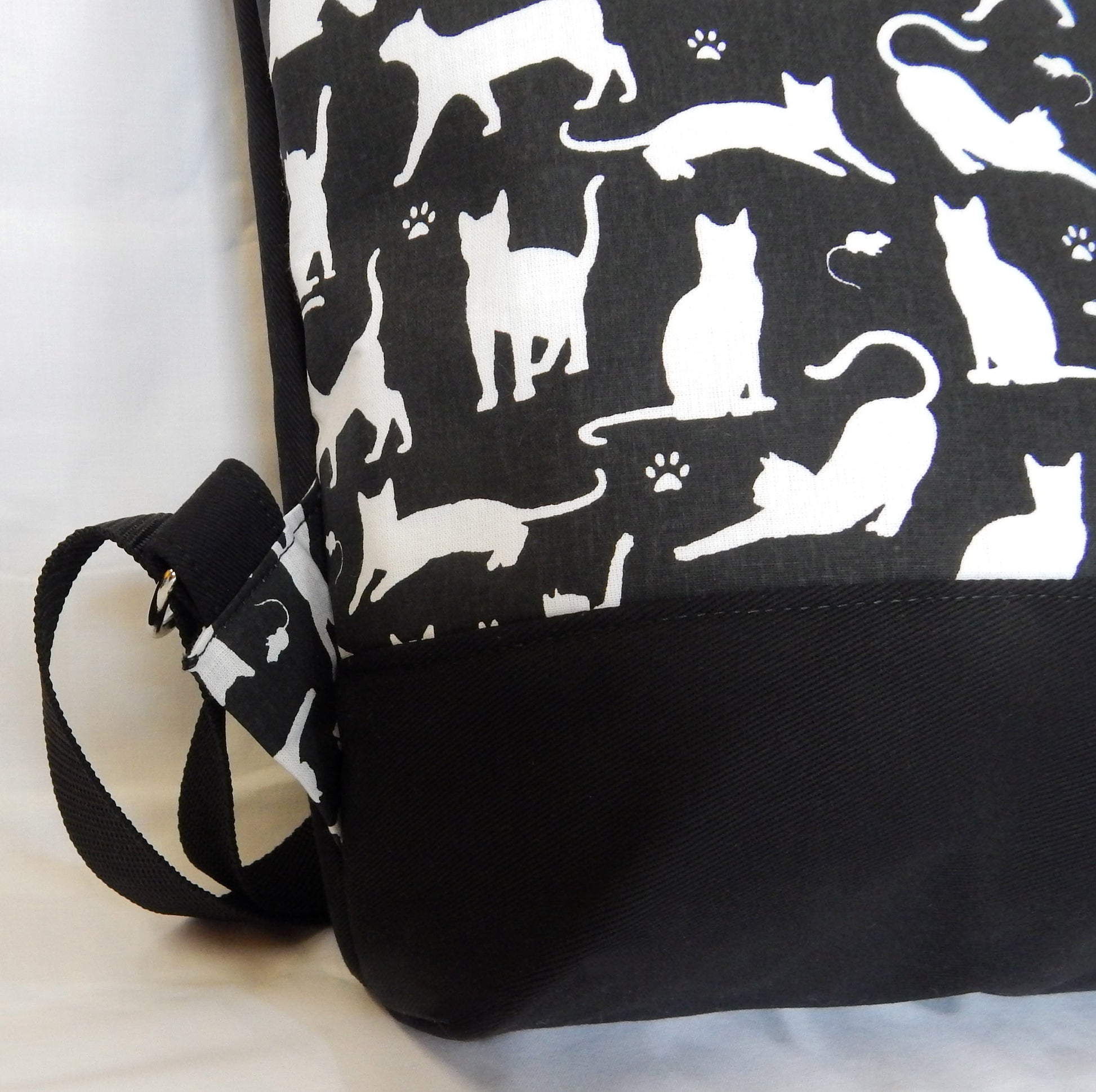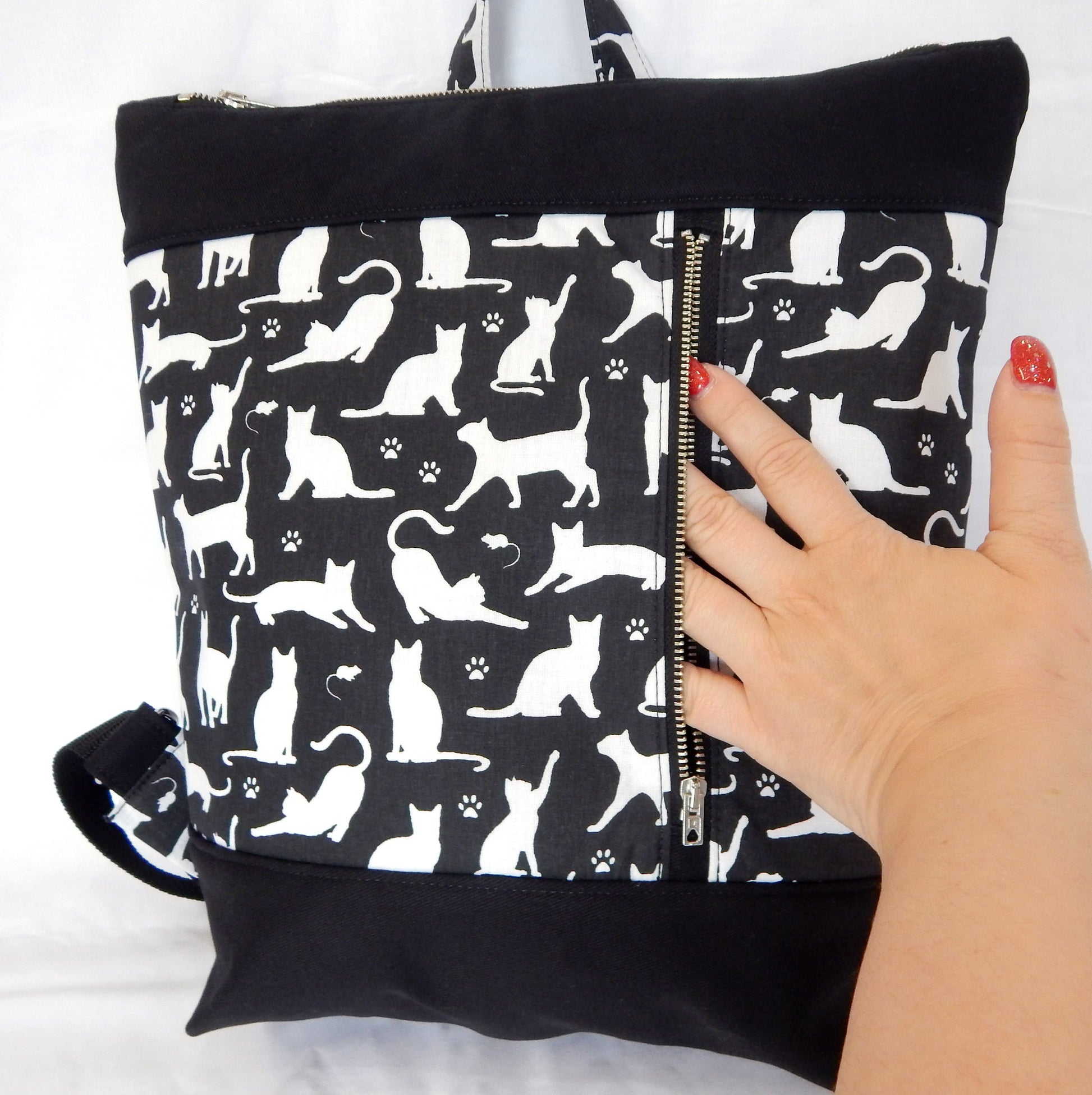 🐈⬛ About: Dive into the world of meow fashion with this handmade Black Canvas Backpack. Crafted from high-quality black cotton twill and adorned with a striking cat print on medium-weight cotton canvas, this backpack seamlessly blends durability and style. The vichy black-white cotton lining adds a sophisticated touch, while the silver-tone metal zipper, metal hooks, and D-rings ensure long-lasting functionality. Designed for everyday use, this backpack offers ample space for A4 files, notebooks, books, and personal essentials, making it both practical and stylish.