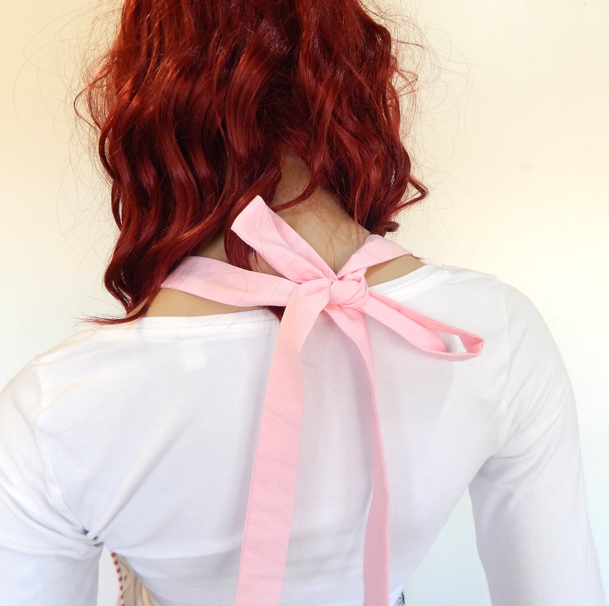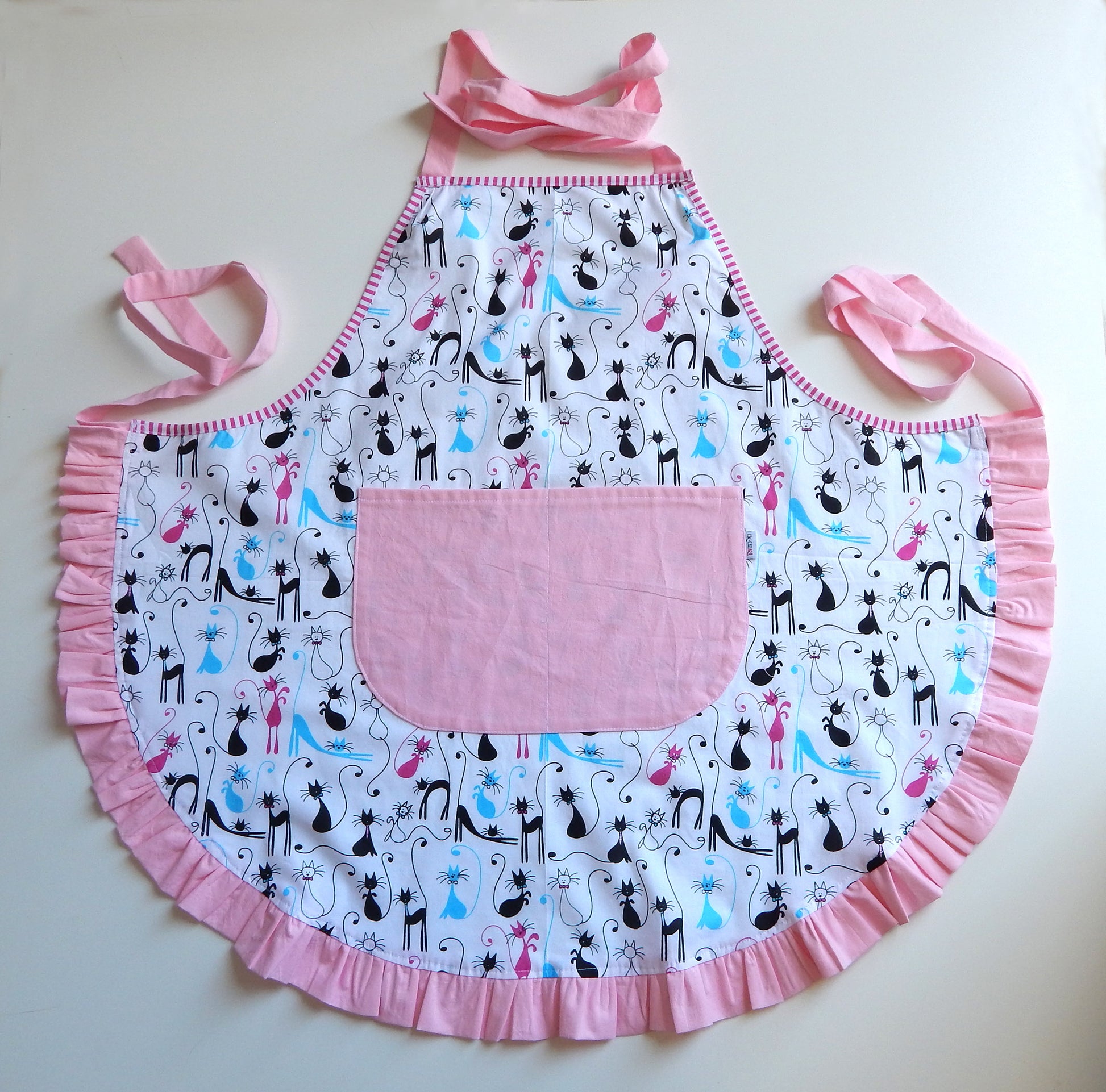 The apron is made of lightweight 100% cotton fabric in two patterns: cat print and pink color cotton.