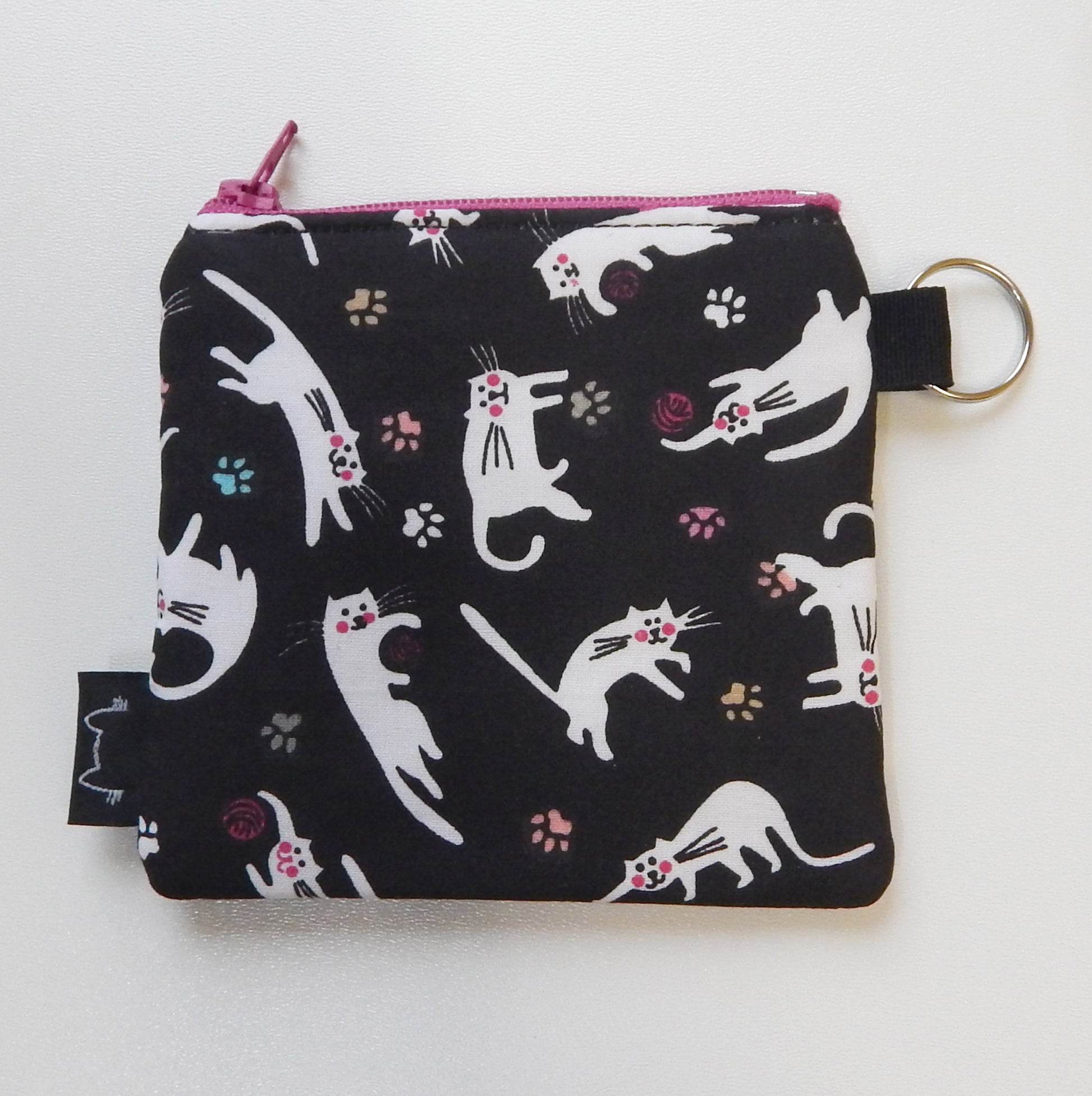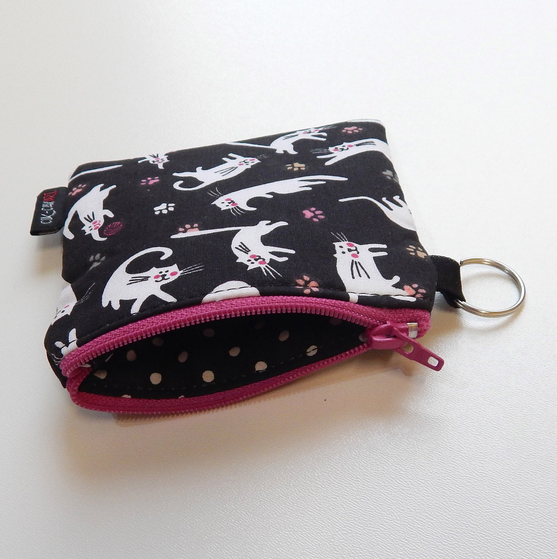 Materials: Crafted from cat-print cotton canvas with a black-and-white polka dot lining for added durability and style. Features a purple plastic zipper for secure closure and a metal ring for versatile use as a pendant or keychain.