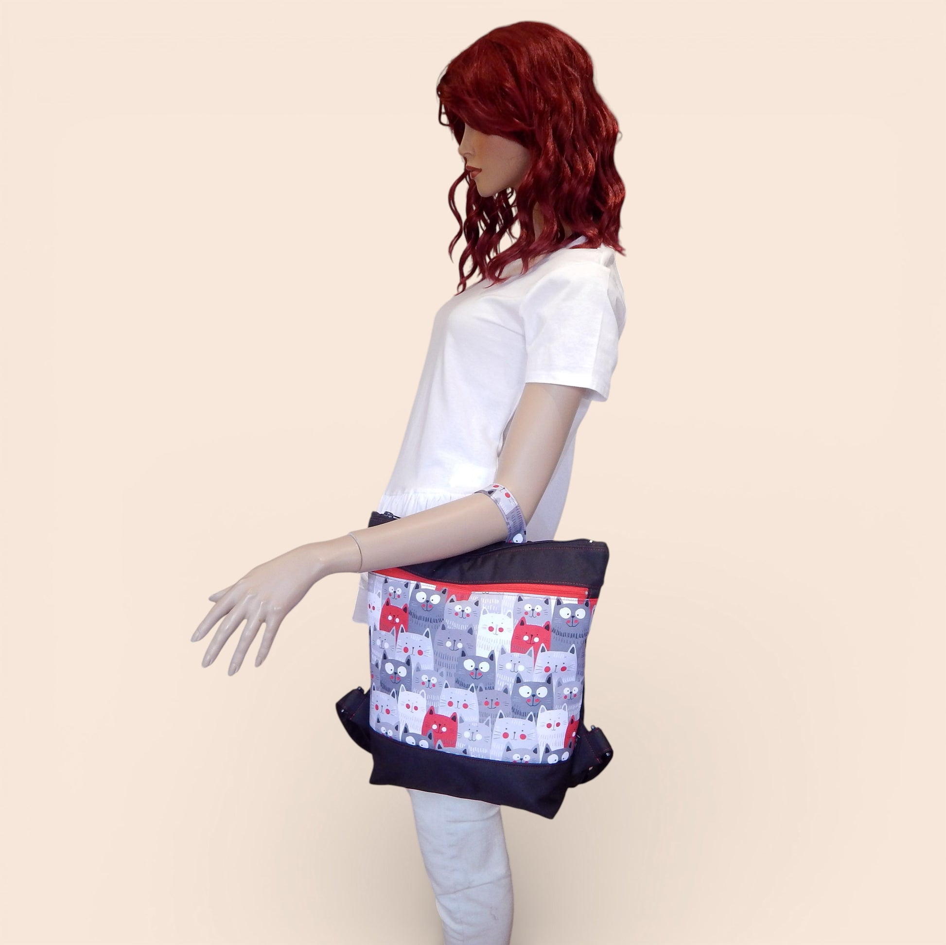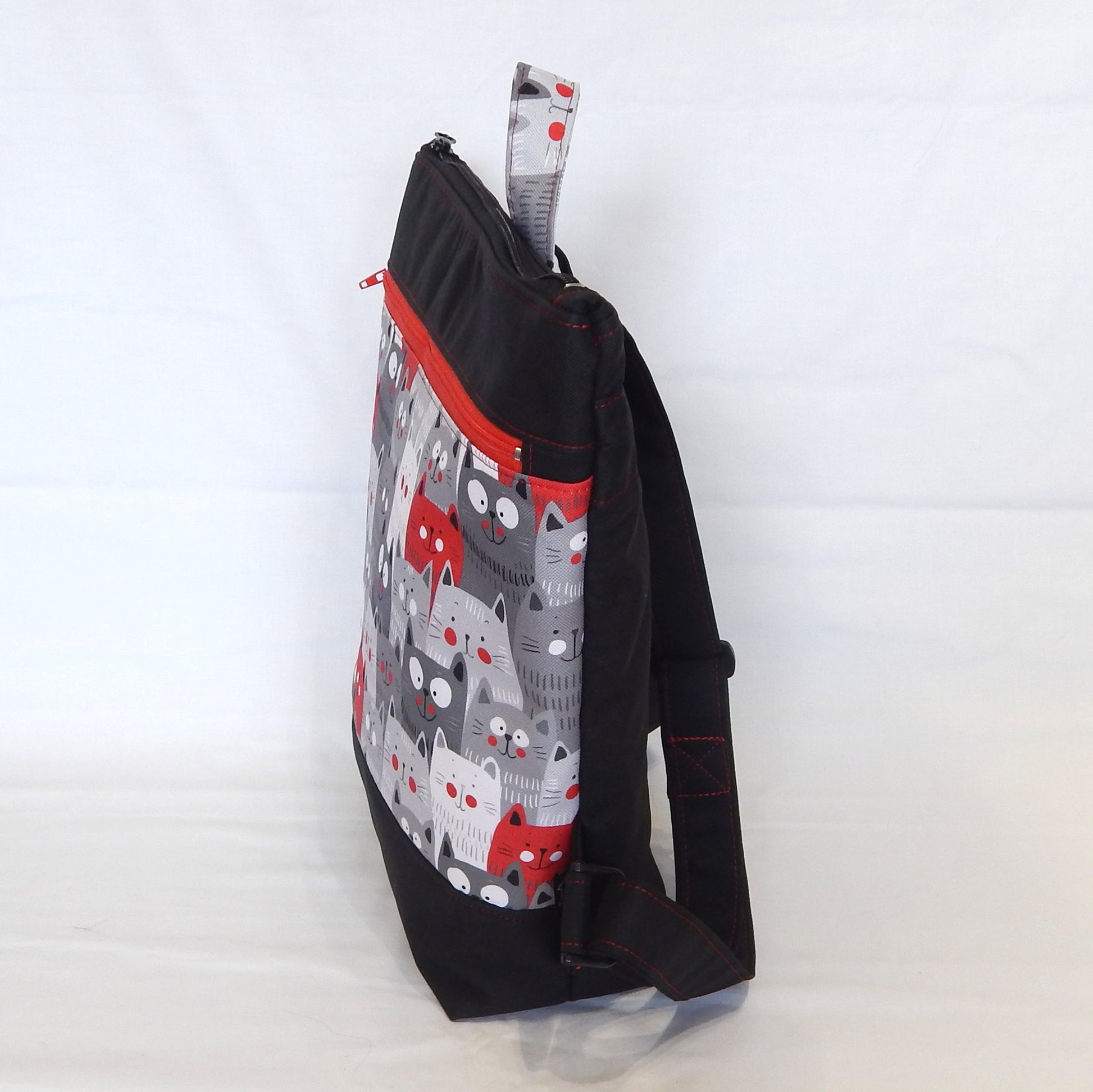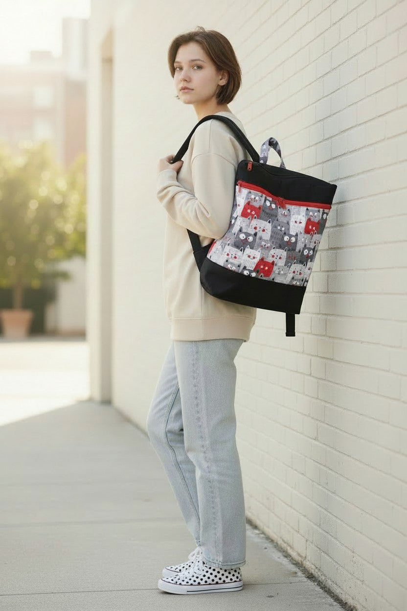 This medium‑sized, durable backpack is crafted from high‑quality water‑resistant fabrics and features an adorable red‑gray cat print and black background. The main printed fabric is a sturdy water‑resistant canvas, while the black sections are made from water‑resistant polyester canvas. For extra strength and shape, the backpack is reinforced with thick interlining and soft padding.