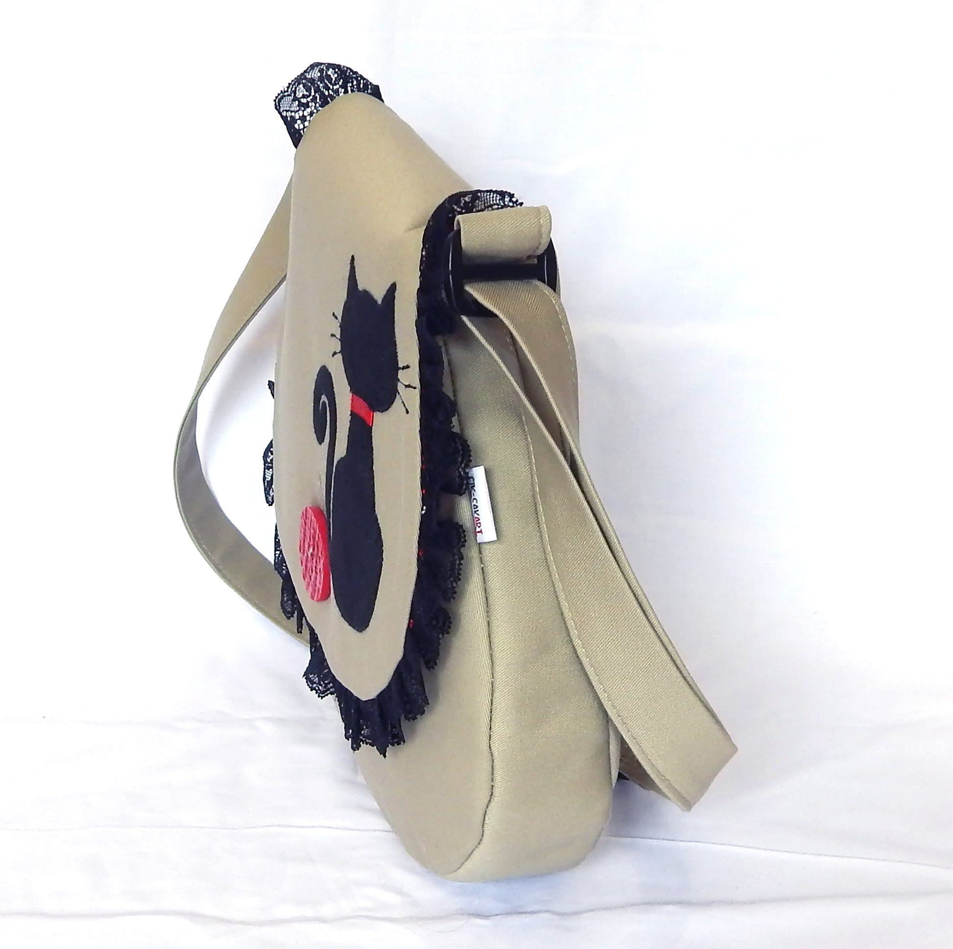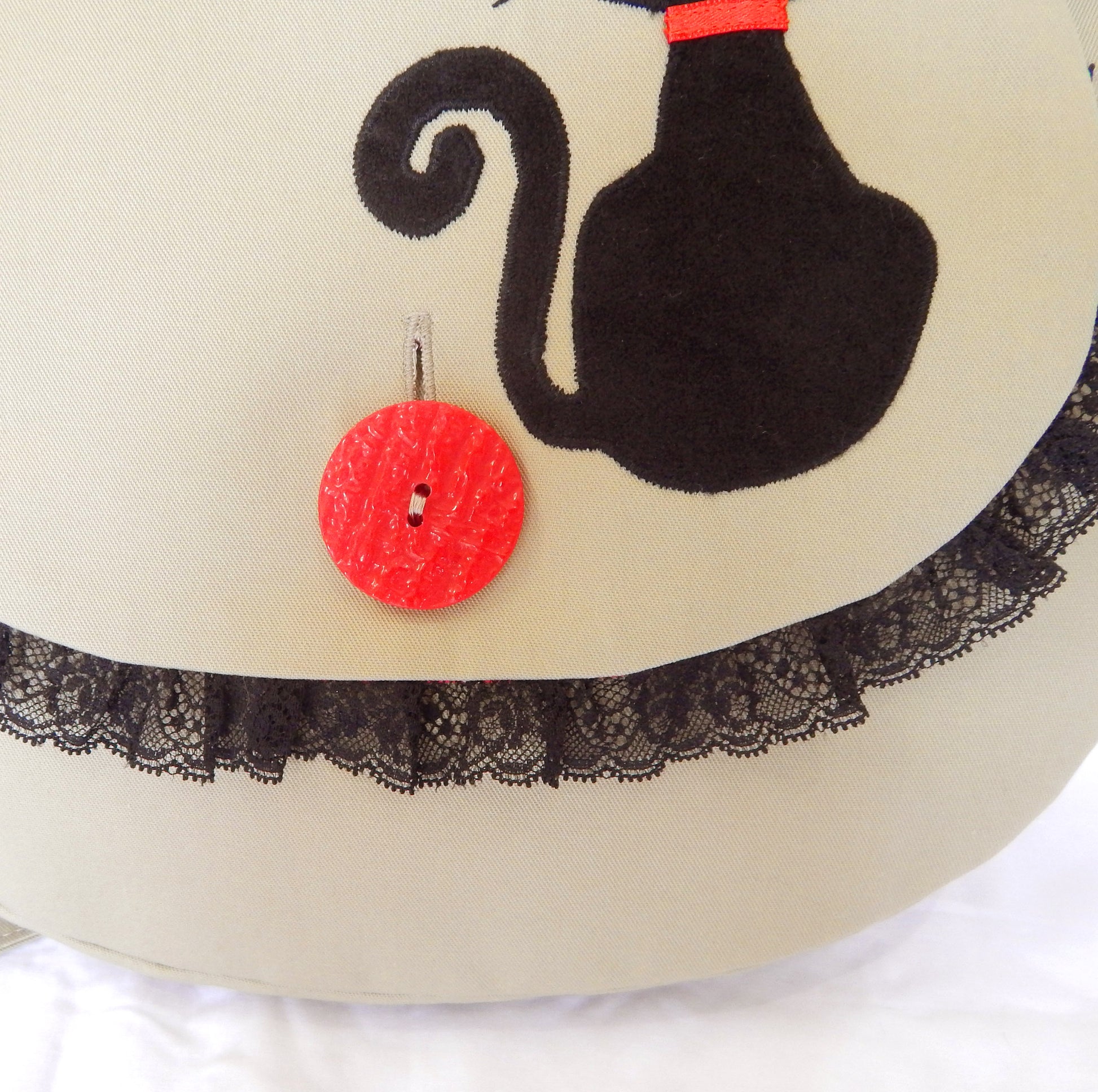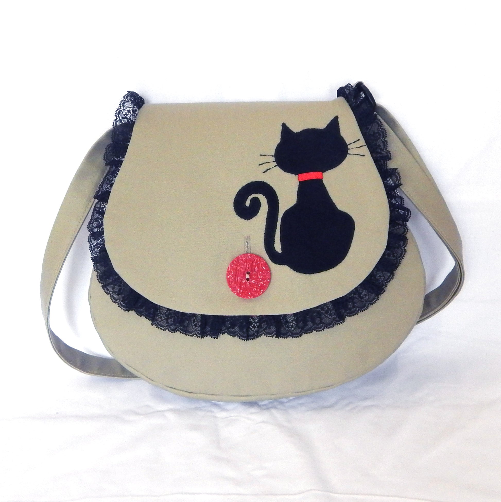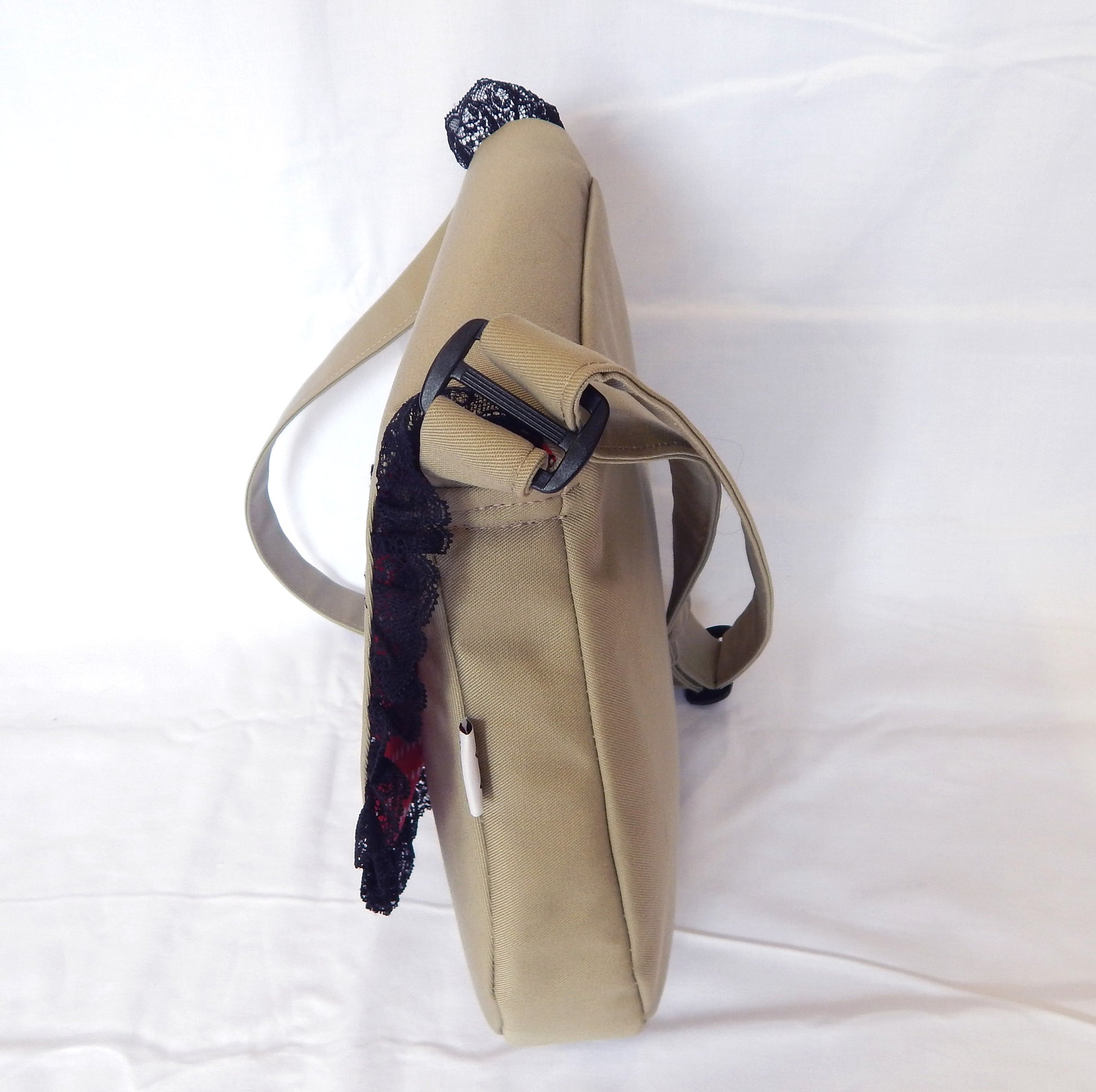 Bag's cover on the front edged with black lace and buttoning with one big red button .